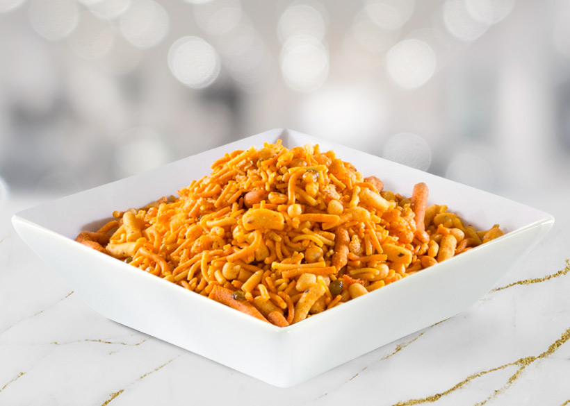 GRAM FLOUR, PALM OIL, LENTILS, RICE FLAKES, GRAM PULSES, GROUNDNUTS, PUFFED RICEM RAISINS, GREEN BENGAL GRAM, CASHEWS, SUGAR, SALT, BLACK SALT, TURMERIC, CUMIN SEEDS, CORIANDER SEEDS, FENNEL SEEDS.